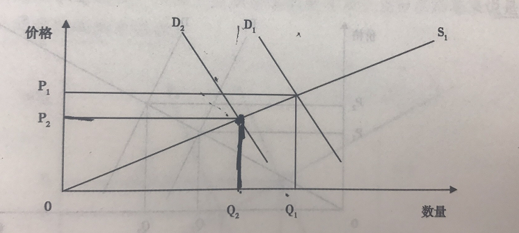 (1)图1价格降低带来需求减少。需求曲线移动到左边,说明目前所有的购买价格水平较低。这个变动的结果是均衡的购买数量减少,均衡价格降低。即均衡数量由Q1下降到Q2,均衡价格由P1下降到P2。