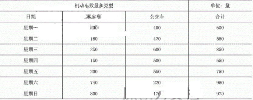 7月14日,星期一,共有600辆机动车通过监测点,其中200辆私家车和400辆公交车。7月15日,星期二,共有580辆机动车通过监测点,其中160辆私家车和420辆公交车。7月16日,星期三,共有850辆机动车通过监测点,其中250辆私家车和600辆公交车。7月17日,星期四,共有650辆机动车通过监测点,分别有150辆私家车和500 辆公交车。7月18日,星期五,通过监测点车辆共计750辆,其中包括200辆私家车和550辆公交车。7月19日,星期六,车辆总数暴增至960辆,其中私家车740辆、公交车220辆。7月20日,星期日,通过车辆共计970辆其中私家车800辆,公交车170辆。