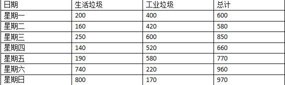 7月14日,星期一,共有600吨垃圾运往回收站,其中200吨是生活垃级,400吨是工业垃圾,7月15日,星期二,运往回收站的生活垃级数量下降到160吨,同时,工业垃圾数量增至420吨,吨位共计580吨,7月16日,星期三,生活垃圾数量增至250吨,工业垃圾达600吨,车吨共计850吨。7月17日,星期四,分别有140吨生活垃级和520吨工业垃圾运往回收站,车吨共计660吨。7月18日,星期五,运往回收站的吨位共计770吨,其中包括190吨生活垃圾和580吨工业垃圾,7月19日,星期六,吨位总数暴增至960吨,其中生活垃圾740吨,工业垃圾220吨,7月20日,星期日,运往回收站的吨位共计970吨,其中生活垃圾800吨,工业垃级170吨。