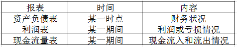 ●资产负债表反映企业某一时点的财务状况;利润表反映企业某一期间的利润或亏损情况:现金流量表反映企业某一期间内现金流入和流出情况。