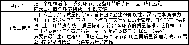 只要在最终生产过程中采用全面质量管理,供应链上的每个环节都会用到全面质量管理的方法,家居公司就能从陈氏公司获得高质量的产品。