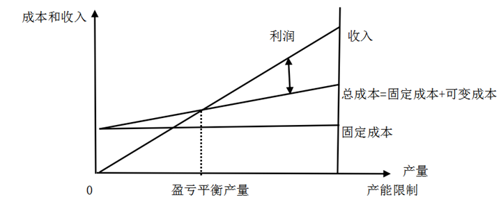 工作总量有限。固定成本与产量无关。产量增加,可变成本上升。利润=收入-成本。盈亏平衡点的产量处:总收入=总成本。