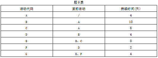 【题目解析】:第一个活动的最早开始时间为0,即A的最早开始时间为0,最早完成时间=最早开始时间+持续时间=0+4=4,紧后活动的最早开始时间=紧前活动的最早完成时间,因此B和C的最早开始时间均为4,B的最早完成时间=最早开始时间+ 持续时间=4+10=14;C的最早完成时间=最早开始时间+持续时间=4+6=10. 有多个紧前活动的,它的最早开始时间选择最早完成时间最大的那一个,比如活动E,它的紧前活动有两个B、C。通过计算可知B稍微最早完成时间最大,为14,故E的最早开始时间为14,最早完成时间=最早开始时间+ 持续时间=14+8=22 ......以此类推,G的最早完成时间=26. 由于G是最后一个活动,因此它的最晚完成时间=最早开始时间=26,故它的最晚开始时间=最晚完成时间-持续时间=26-4=22 。紧前活动的最晚完成时间=紧后活动的最晚开始时间,故活动F的最晚完成时间=22,最晚开始时间=最晚完成时间-持续时间=22-2=20.有多个紧后活动的,它的最晚完成时间=紧后活动最晚开始时间最小的那个,比如活动B,有两个紧后活动D、E,通过计算可知活动E的最晚开始时间最小为14,,因此活动B的最晚完成时间,14......以此类推。最后找到关键路径ABEG=4+10+8+4=26 ,即为最短所需时间。