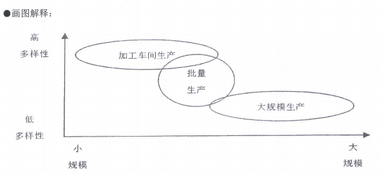 (1)制造过程的选择需要考虑生产的规模及产品的多样性,如上图所示:横轴代表产量;纵轴代表产品的多样性。(2)当产品类型高多样性、每种产品生产规模小时(甚至一种设计只生产一件产品),选择加工车间生产;(3)当产品类型中多样性、中等生产规模时,选择批量生产;(4)当产品类型低多样性或没有多样性、生产规模大时,选择大规模生产。