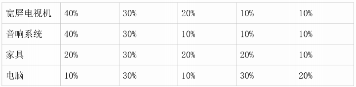 涉及的商品如下:一个餐桌;一个宽屏电视机;一个昂贵的音响系统;舒适的家具;一台电脑。