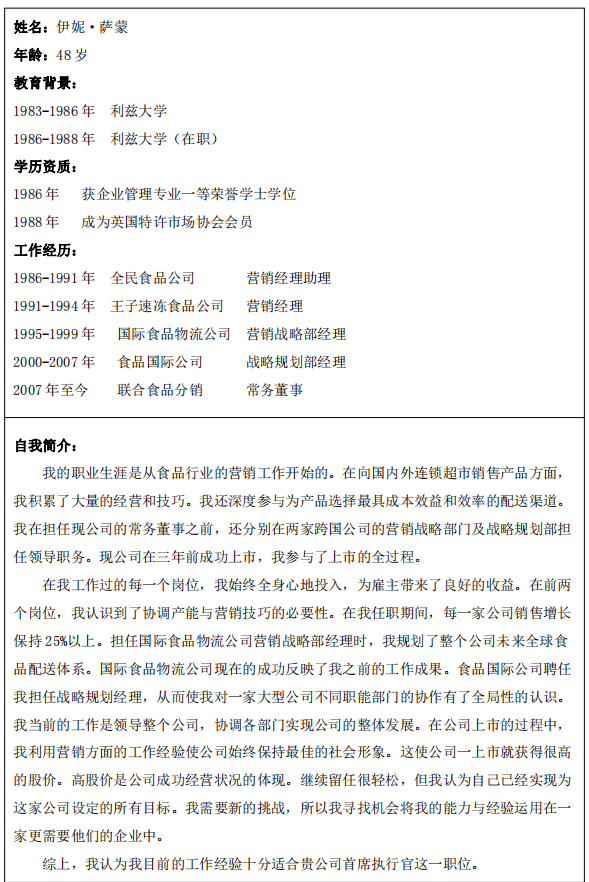 二、写一份应聘者分析报告,对每一位应聘者的优势、劣势进行分析。推荐一位你认为可以胜任北岸公司首席执行官的最佳人选,并阐述你的理由。