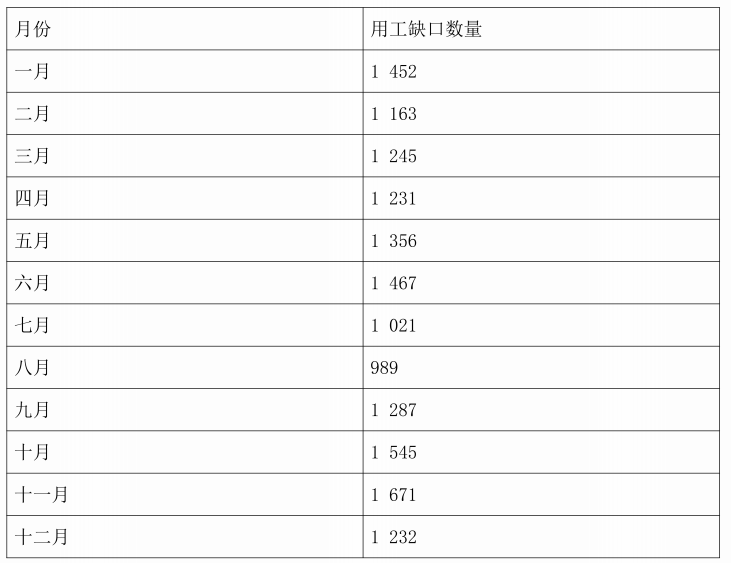 表12显示了2009年记录的河边市用工缺口数量。