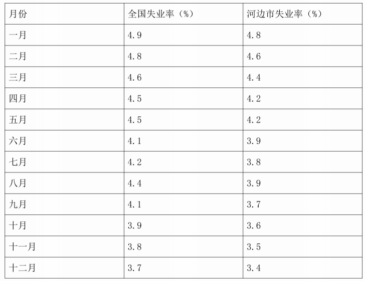 厂和船舶制造厂宣布裁员和关闭的时候,失业率上涨得更高,这给当地社区生活带来了灾难性的冲击。但是,最近两年这一趋势出现了逆转。一些公司开始迁入这一地区,其他公司开始扩招。表13是200年全年河边市和全国失业率统计表。