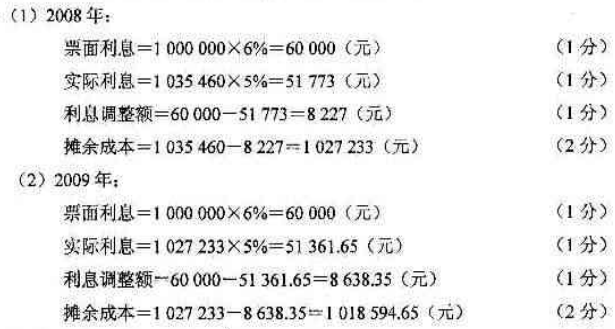 某公司于2008年1月1日,以银行存款1035460元购入新华公司于同日发行的4年期债券。该债券面值为1 000 000元,票面 作者:高老师 时间:2024-07-23 浏览 1 某公司于2008年1月1日,以银行存款1035460元购入新华公司于同日发行的4年期债券。该债券面值为1 000 000元,票面利率为6%,每年年末付息,到期一次支付本金。假定实际利率为5%。 要求:(1)计算2008年的该债券票面利息、实际利息、利息调整额和摊余成本。 (2)计算2009年该债券票面利息、实际利息、利息调整额和摊余成本。【正确答案】: 📱 扫码体验刷题小程序 扫一扫使用我们的微信小程序