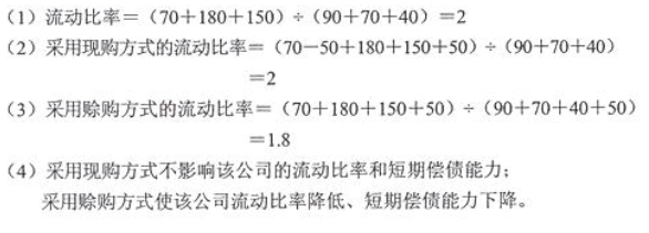 2010年12月20日,戊公司召开经营状况分析会,采购部经理提出,12月份准备购入原材料50万元。假定12月份除购入原材料业务外涉及的其它资产、负债数据不变。2010年11月,戊公司资产负债表(简表)如下: 资产负债表(简表) 戊公司 2010年11月30日 单位:万元 资产 期末余额 负债和所有者权益 期末余额 货币资金 70 短期借款 90 应收账款 180 应付账款 70 存货 150 应交税费 40 长期资产 400 长期负债 250 所有者权益 350 资产总计 800 负债和所有者权益总计 800 要求:(1)计算戊公司2010年11月末的流动比率; (2)若采取现购方式购入原材料50万元,计算戊公司12月末的流动比率; (3)若采取赊购方式购入原材料50万元,计算戊公司12月末的流动比率; (4)分析说明上述两种不同付款方式对流动比率和短期偿债能力的影响。