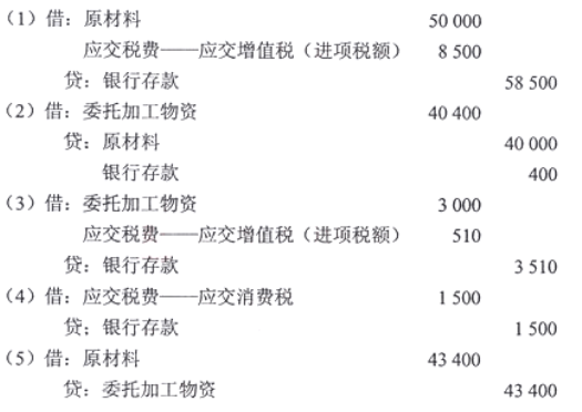 乙公司为增值税一般纳税人,原材料核算采用实际成本法。发生有关经济业务如下: (1)购入原材料一批,取得增值税专用发票上注明的价款为50000元,增值税税额为8500元,原材料验收入库,款项以银行存款支付; (2)委托A公司加工材料一批,发出材料实际成本为40000元,以银行存款支付运输费400元,该批材料收回后用于连续生产应税消费品; (3)支付该批材料的加工费,取得增值税专用发票上注明加工费为3000元,增值税税额为510元,以银行存款付讫; (4)以银行存款支付委托方代收代缴的消费税1500元; (5)该批委托加工材料全部收回并验收入库。 要求:(1)编制购入原材料的会计分录; (2)编制发出委托加工材料的会计分录; (3)编制支付加工费和增值税进项税额的会计分录; (4)编制支付消费税的会计分录; (5)编制委托加工材料收回入库的会计分录。