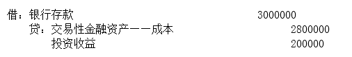 丙公司为增值税一般纳税人,2015年12月发生经济业务如下:(1)赊销商品,价款1000000元,增值税税额170000元,商品成本800000元。(2)发行股票800000股,每股面值1元,每股发行价5元,收到股款存入银行。(不考虑股票发行费用)(3)出售交易性金融资产,售价3000000元,账面价值2800000元,其中:成本2800000元,公允价值变动0元。(4)上月销售商品,因质量问题,经协商给予购货方10%的折让,贷款尚未收到,该商品销售时售价200000元,增值税税额3000元。按规定,发生的折让允许抵减当期增值税。要求:(“应交税费”和“交易性金融资产”科目要求写明细科目)编制出售交易性金融资产的会计分录;