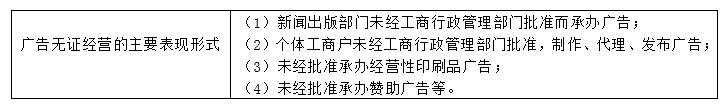广告无证经营的主要表现形式有 ( ) 作者:高老师 时间:2024-07-23 浏览 4 广告无证经营的主要表现形式有 ( )A、个体工商户未经批准从事广告设计制作B、新闻出版部门未经批准承办广告C、未经批准承办经营性印刷品广告D、广告客户自行制作广告E、批准经营文化类广告的承办商品广告【正确答案】:ABC【题目解析】:快速记忆点:广告无证经营都是未经批准xxx。 📱 扫码体验刷题小程序 扫一扫使用我们的微信小程序