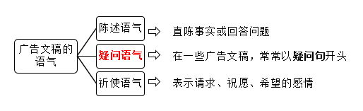 广告标题“总督牌香烟能够给您而别的香烟不能给您的是什么”使用的语气是( ) 作者:高老师 时间:2024-07-23 浏览 1 广告标题“总督牌香烟能够给您而别的香烟不能给您的是什么”使用的语气是( )A、陈述语气B、祈使语气C、疑问语气D、肯定语气【正确答案】:C【题目解析】:题干“......是什么”使用了疑问句,该广告使用的是疑问语气。 📱 扫码体验刷题小程序 扫一扫使用我们的微信小程序