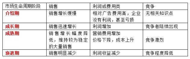 衰退期:一般伴随替代新产品出现,销售明显减少,利润收益减少,竞争程度降低。