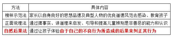 星泽不肯好好吃饭,边吃边玩,妈妈提醒了也无济于事。妈妈阻止了奶奶追喂,在饭点过后撤掉了饭碗,星泽后来饿了好半天,此后就好好吃饭了 作者:高老师 时间:2024-07-23 浏览 0 星泽不肯好好吃饭,边吃边玩,妈妈提醒了也无济于事。妈妈阻止了奶奶追喂,在饭点过后撤掉了饭碗,星泽后来饿了好半天,此后就好好吃饭了。星泽妈妈的做法运用了( )A、正面说理法B、榜样示范法C、实际锻炼法D、自然后果法【正确答案】:D【题目解析】:C项未提及,为干扰项,排除;星泽不好好吃饭,星泽妈妈饿了他好半天。体现了让孩子体验由于自己的不良行为所造成的后果来纠正其行为。故正确答案为D项。 📱 扫码体验刷题小程序 扫一扫使用我们的微信小程序