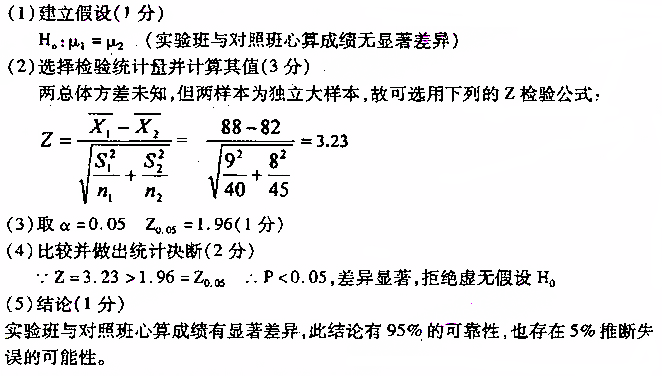 某幼儿园实验班心算平均成绩为88分,标准差为9分,共40人参加测试;对照班平均成绩为82分,标准差为8分,共45人参加测试。问实 作者:高老师 时间:2024-07-24 浏览 8 某幼儿园实验班心算平均成绩为88分,标准差为9分,共40人参加测试;对照班平均成绩为82分,标准差为8分,共45人参加测试。问实验班与对照班心算成绩是否有差异?(取=0.05下限Z(下标0.05)=1.96)【正确答案】: 📱 扫码体验刷题小程序 扫一扫使用我们的微信小程序