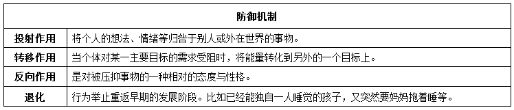 当学前儿童过渡焦虑或精神上受到伤害时,行为举止会重返早期的发展阶段,这种防御机制叫做() 作者:高老师 时间:2024-07-24 浏览 0 当学前儿童过渡焦虑或精神上受到伤害时,行为举止会重返早期的发展阶段,这种防御机制叫做()A、反向作用B、投射作用C、退化D、转移作用【正确答案】:C【题目解析】:本题考查了防御机制中的退化,选项中的几种防御机制如下表所示: 📱 扫码体验刷题小程序 扫一扫使用我们的微信小程序