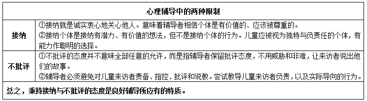 本题考查了心理辅导中的两种限制:接纳和不批评,需要答出两种限制分别是什么,并展开论述。展开论述时可分别阐述两种限制的意含,以及对应到儿童时辅导者应该如何做。