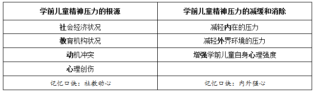 本题考查了学前儿童精神压力的根源及其缓减和消除,需要答出四个根源和减缓消除的三个方面,可结合口诀进行记忆。