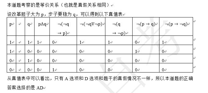 与“改革要胆子大,也要步子稳”不具有等价关系的有() 作者:高老师 时间:2024-07-24 浏览 0 与“改革要胆子大,也要步子稳”不具有等价关系的有()A、并非“如果改革不要步子稳,那么就要胆子大”B、并非“改革或者不要步子稳,或者不要胆子大”C、并非“如果改革要步子稳,就不要胆子大”D、并非“只有改革胆子大,才会步子稳”E、并非“如果改革要胆子大,就不要步子稳”【正确答案】:AD【题目解析】: 📱 扫码体验刷题小程序 扫一扫使用我们的微信小程序