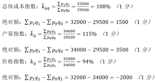 分析:该公司产品总体成本报告比基期提高8%,增加1500元,是有产量提高15%,使总成本增加3500元和销售价格降低6%,使总成本减少2000元,两个因素共同作用的结果。(1分)