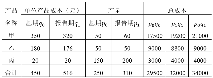 计算三种产品的总成本指数和产量总指数,并分析由于单位成本和产量变动对总成本的影响。