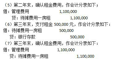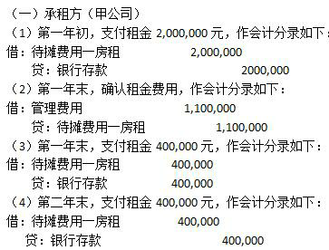 2001年1月1日,甲公司向乙公司采用经营租赁方式租入全新办公用房一套,租期为3年。办公房的价值为50,000,000元,预计使用年限为50年。租赁合同规定,租赁开始日甲公司向乙公司支付第一期租金2,000,000元,第一年年末支付第二期租金400,000元,第二年末支付第三期租金400,000元,第三年年末支付第四期租金500,000元。租赁期满后乙公司收回办公用房使用权,三年的租金总额为3,300,000元。(假设甲公司和乙公司均在年末按直线法确认租金费用和租金收入,并且不存在租金逾期支付的情况。)