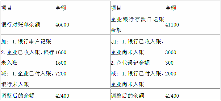 (5)6月30日,存入银行支票一张,金额为1500元,银行已承办,企业已凭回单记账,对账单并没有记录。