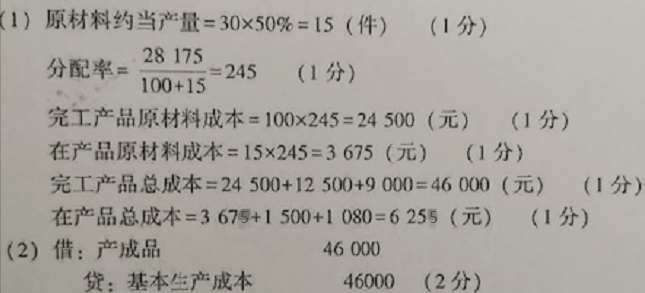 某企业生产A产品,原材料在生产开始时投入50%,其余部分在产品加工到50%时再投入,其他费用随加工进度均匀发生,月初加工消耗原材 作者:高老师 时间:2024-07-25 浏览 1 某企业生产A产品,原材料在生产开始时投入50%,其余部分在产品加工到50%时再投入,其他费用随加工进度均匀发生,月初加工消耗原材料28175元,完工产品工资费用12500元,在产品工资费用1500元,完工产品制造费用9000元,在产品制造费用1080元。本月完工100件,月末在产品30件。要求:(1)按约当产量法计算完工产品和在成本。(2)依据产成品成本汇总表,做相关会计分录。【正确答案】: 📱 扫码体验刷题小程序 扫一扫使用我们的微信小程序