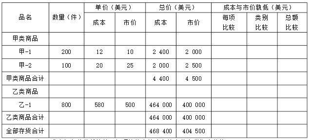要求:(1)运用成本与市价孰低法按照每项比较办法确定该企业存货期末价值。(2)运用成本与市价孰低法按照类别比较办法确定该企业存货期末价值。(3)运用成本与市价孰低法按照总额比较办法确定该企业存货期末价值。(注:将计算结果填入表中)