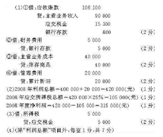 光华公司2008年1月至11月实现利润总额400 000元,累计已交所得税100 000元。2008年12月份发生的经济业务如下: (1)销售乙产品30件,价款总额90 000元,增值税销项税额15 300元;以银行存款支付代垫运费800元。全部款项尚未收到。 (2)以银行存款支付12月份短期借款利息5 000元(该企业未预提借款利息)。 (3)结转本月已销产品的生产成本40 000元。 (4)计提本月行政管理部门使用固定资产的折旧费20 000元。 (12月份,公司主营业务税金及附加7 000元,营业外收入3 000元,营业外支出1 000元,未发生营业费用和投资收益,利润总额为20 000元,所得税税率25%。除上述资料外,不考虑其他因素。) 要求: (1)编制12月份上述经济业务(1)至业务(4)的会计分录(只要求写出总账科目)。 (2)计算2008年光华公司的利润总额、应交所得税总额及净利润。 (3)编制12月份应交所得税的会计分录。 (4)根据上述资料,将正确数字填入利润表相关项目的括号内。 利润表 编报单位:光华公司 2008年12月 单位:元