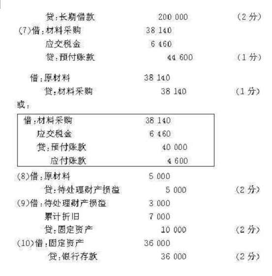 光华公司2008年3月份发生以下经济业务: (1)5日,从A公司购进甲材料10吨,每吨1 600元,增值税进项税额2 720元。材料尚在运输途中。发票已到,全部款项尚未支付。 (2)7日,上项甲材料验收入库,结转材料的采购成本。 (3)10日,收到某公司作为投资投入的新设备一台,确认价值为20 000元。 (4)15日,用银行存款偿还前欠A公司货款5 000元。 (5)20日,上月投入需安装的设备本月安装完毕,经验收合格交付使用,其实际成本为50 000元。 (6)26日,从银行取得二年期借款200 000元存入银行。 (7)28日,收到B公司销货发票,其中材料价款38 000元,增值税进项税额6 460元,代垫运费140元,共计44 600元。材料已验收入库,去年已预付货款40 000元,其不足部分尚未支付。 (8)31日,盘盈材料一批,估计价值为5 000元,原因待查。 (9)31日,盘亏机器一台,原值10 000元,已提折旧7 000元,原因待查。 (10)31日,经查发现,上月购入设备一台,价款40 000元已用银行存款支付,记账凭证中应借应贷的会计科目正确,但将金额误记为4 000元,并已登记入账。现予以更正。 要求:逐笔编制上述经济业务的会计分录(只要求写出总账科目)。