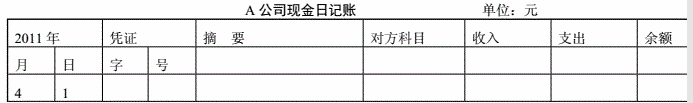 资料:2012年3月31日A公司现金日记账余额8 000元,4月1日共发生如下现金收支业务: (1)用现金购买行政办公用品400元; (2)从银行提取现金5 000元备用; (3)用现金支付销售商品市内运费800元。 要求:(1)根据上述资料编制会计分录; (2)登记现金日记账。