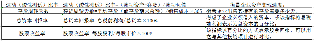 速动(酸性测试)比率=(流动资产-存货)/流动负债 该指标衡量企业资产变现速度;