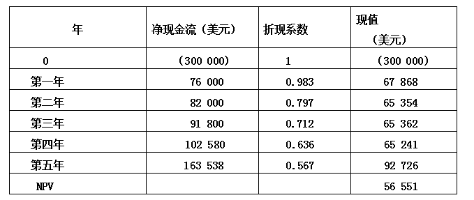 随着公司实力的进一步增强,为节省配送业务外包支出,兄弟俩开始考虑自己购买运输设备。设备的初始投资成本为300 000美元,预计使用寿命5年,第五年年末可以出售,售价50 000美元。银行已同意为购买设备提供全额贷款,年利率12%。自购运输设备在未来五年将发生如下现金支出: