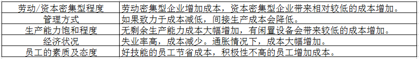 (5)员工的素质及态度:具备良好技能的员工工作效率会更高,从而带来高产量。积极性不高的员工对于产量增加会产生较大的抵触情绪,因而可能会增加成本。