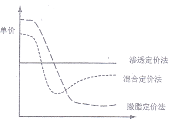 (1)撇脂定价法:这种方法通过高价获取高额利润。这种定价策略通常意味着企业开发了一种需求量很大的创新性和时尚性的产品。在供货量达到较高水平之前,价格都可以很高。一旦开发这种产品的企业或进入该市场的竞争者提高了商品的供应量,就应调低价格。撇脂定价法使创新性企业在产品周期的初期,利用高需求、低供给来迅速地使研发成本得到补偿。(2)渗透定价法:渗透定价法利用低价格扩大市场份额,从而向市场渗透;也可以在市场上推出生命周期长并有增长潜力的新产品。(3)混合定价法:这种定价法最初使用撇脂定价法,然后当竞争加剧后,降低价格。企业偶尔为了获得更高的市场份额,也会将售价降低到成本以下,以消除竞争。当达到目的后再提高价格。撇脂定价法、渗透定价法和混合定价法之间的区别可以通过下图来表示: