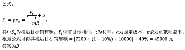 某企业一商品的固定成本为10000元,贡献毛益率为40%,企业制定的税前目标利润为7200元,企业税率为10%,则其税后目标销售 作者:高老师 时间:2024-07-26 浏览 0 某企业一商品的固定成本为10000元,贡献毛益率为40%,企业制定的税前目标利润为7200元,企业税率为10%,则其税后目标销售额为( )A、40000元B、45000元C、18000元D、30000元【正确答案】:B【题目解析】: 📱 扫码体验刷题小程序 扫一扫使用我们的微信小程序