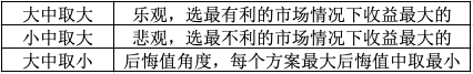 在几种不确定的结果中,选择在最大后悔值中的最小值方案作为最优方案的决策方法是( ) 作者:高老师 时间:2024-07-26 浏览 0 在几种不确定的结果中,选择在最大后悔值中的最小值方案作为最优方案的决策方法是( )A、乐观的决策方法B、小中取大法C、大中取小法D、大中取大法【正确答案】:C【题目解析】:考查常见的不确定性决策准则:大中取大属于乐观的决策方法。题目关键词:后悔值,故本题选C 📱 扫码体验刷题小程序 扫一扫使用我们的微信小程序