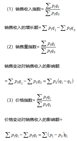 使用销售额指数、销售量指数和价格指数可分别计算出销售收入、销售量和价格的增长百分比,然后用各个指数的分子减去分母就分别得到销售收入的绝对增长额、销售量变动引起的销售收入增长额和价格变动引起的销售收入增长额,后二者之和正好等于销售收入的增长额。或使用公式:使用此指数体系可以计算出企业产品销售收入的变动、以及产品销售量和价格变动二者各自的影响: