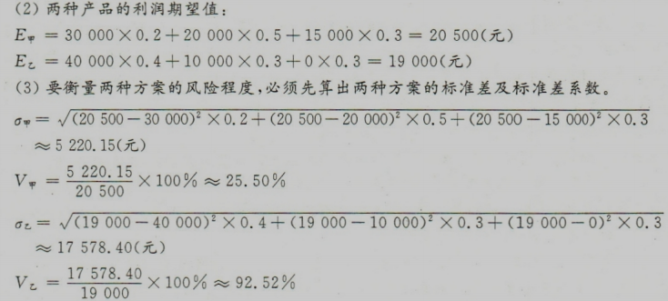 (4)由上面的计算结果可以看出,甲产品的利润期望值大于乙产品,而生产甲产品的风险也比乙产品小,标准差越大说明生产的风险越大,在进行决策时,一般倾向于选择标准差小的方案,综上所述该企业应该选择生产甲产品。p245-246