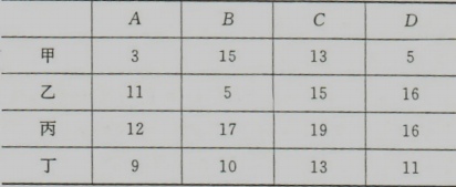 某公司决定派甲、乙、丙、丁四人去完成A、B、C、D四个项目,每个人分工不同,每个人只能完成其中的一项工作,假如四个人完成四个项目所需的经费(单位:千元)如下表所示。