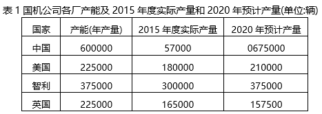 (2)国机公司的智利研发部已开始研发使用替代燃料(如电力或生物能)的产品,以及使用传统燃料与替代燃料相结合的混合动力车,公司早期研发有利于公司在这里的投产。(4 分) (3)根据各国工厂 2020 年的预计产量和产能之间的对比情况可以看出,虽然美国和英国的产能还有剩余,但这两个国家的直接人工成本太高,不予考虑。而中国产量已经超过产能,智利的产能和产量基本相当,还有一定增长的空间。(4 分) 表 1 国机公司各厂产能及 2015 年度实际产量和 2020 年预计产量(单位:辆)![]() |