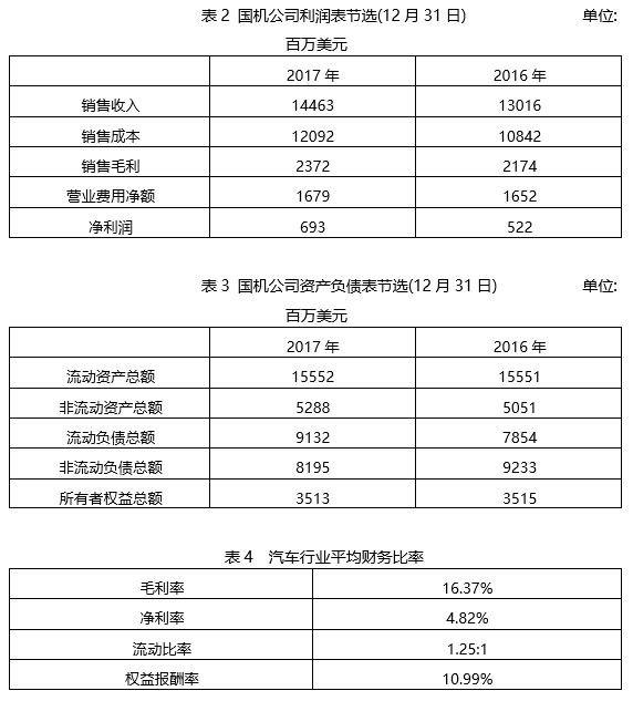 中国总部负责制定公司的营销战略,各厂的市场营销总监负责所在国的具体营销活动。各厂生产的车型由总部决定,促销、渠道和定价则由各地分厂负责。国机公司将产品营销预算经费中大部分用于投放电视广告,在总部看来这是吸引潜在消费者的最佳媒介。每个系列车型的营销思路各不相同,广告针对该系列车型的目标市场而确定。例如,小型轿车的电视广告情景是一对年轻夫妇晚上在城市畅行,白天去海边自由驾乘。家用轿车的电视广告则展现了一家人驾车出游的场景,强调宽敞的存储空间和搭乘五人的车载能力。 (三)财务信息国机公司及汽车行业的相关财务信息节录如下:
