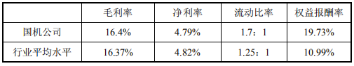 国机公司 2017 年的流动比率较 2016 年有所降低,由 1.98 降至为 1.7,短期偿债能力略有降低,但仍处于比较理想的状态。资产负债率处于较高的水平且较平稳,长期偿债能力有待改善。权益报酬率 2017 年较 2016 年有所提高,由 14.85%提高至 19.73%,股东的回报程度提高。(10 分) (3)国机公司的相关财务指标与行业平均水平的对比分析
