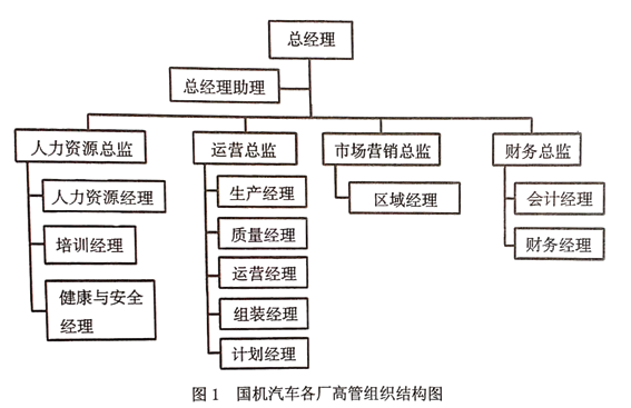国机公司目前主要生产一种适合城市道路的低油耗小型汽车,同时还生产一系列的家用轿车,在基础车型上开发了具有不同车身外观和发动机类型的产品,分为汽油车和柴油车,发动机排量为1.4升、1.6升、1.8 升和2.0升。公司的目标是为高销量市场提供大众化的车型,并未涉足跑车和越野车市场。国机公司的经营策略是尽可能在目标销售市场所在国生产汽车,这样可以削减运输成本,并将汇率波动带来的风险最小化。这意味着各国工厂最大限度地独立经营,而设在中国的总部负责总体调控,扮演战略决策中心的角色。 (二)组织结构公司董事会设在中国,负责制定战略规划。中国总部设有人力资源、市场营销和财务中心,负责为各厂制定相应的战略政策。产品研发部门也设在中国,由总部直接控制。每个工厂根据日常的业务流程独立从事运营活动,具有很大的自主经营权。各厂设置一名总经理,负责向董事会汇报,并定期到中国参加例会。各厂的中高层雇员结构基本相同,在各职能部门内,还设有大量的主管和普通员工岗位,人员数量取决于当地业务规模,组织结构如图1所示。各厂人力资源部负责本厂员工的招募、遴选和培训。雇员薪资水平参照区域内同类企业情况,因此,国机公司员工薪酬因所在国家不同而有所差异。
