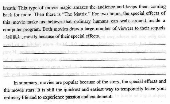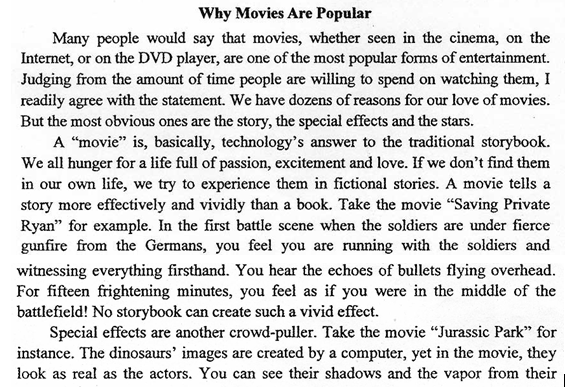 【题目解析】:通过仔细阅读,该篇章内容及结构清晰,根据要求及内容本文属于说明文,要合理补全主体段,我们需要明确该补充什么内容,以及该以怎样的方式将其呈现出来。除了逻辑上的有效分析之外,我们还应该了解到thesis statement是补全文章内容的基础和指针。 一个合格的thesis statement 不但是全文的中心思想句,还进一步明确并限制了每一个主体段落的大体内容及行文方式。这类题目旨在考察学生对thesis statement作用的认识以及学生对文章的Unity和Coherence的把握。该文章第一段的最后一句至关重要,因为它引出了接下来的几个段落中心,说明人喜欢一部电影的主要因素有三个:故事、特效、明星。接下来的段落中,故事和特效都分别被列出讨论,而在最后的summary之前还缺失了stars这个重要的点,这样,我们可以很快捕捉到关于补写内容的一个重要信息。缺失的部分应该是关于明星因素对于人是否喜爱一部电影的影响。