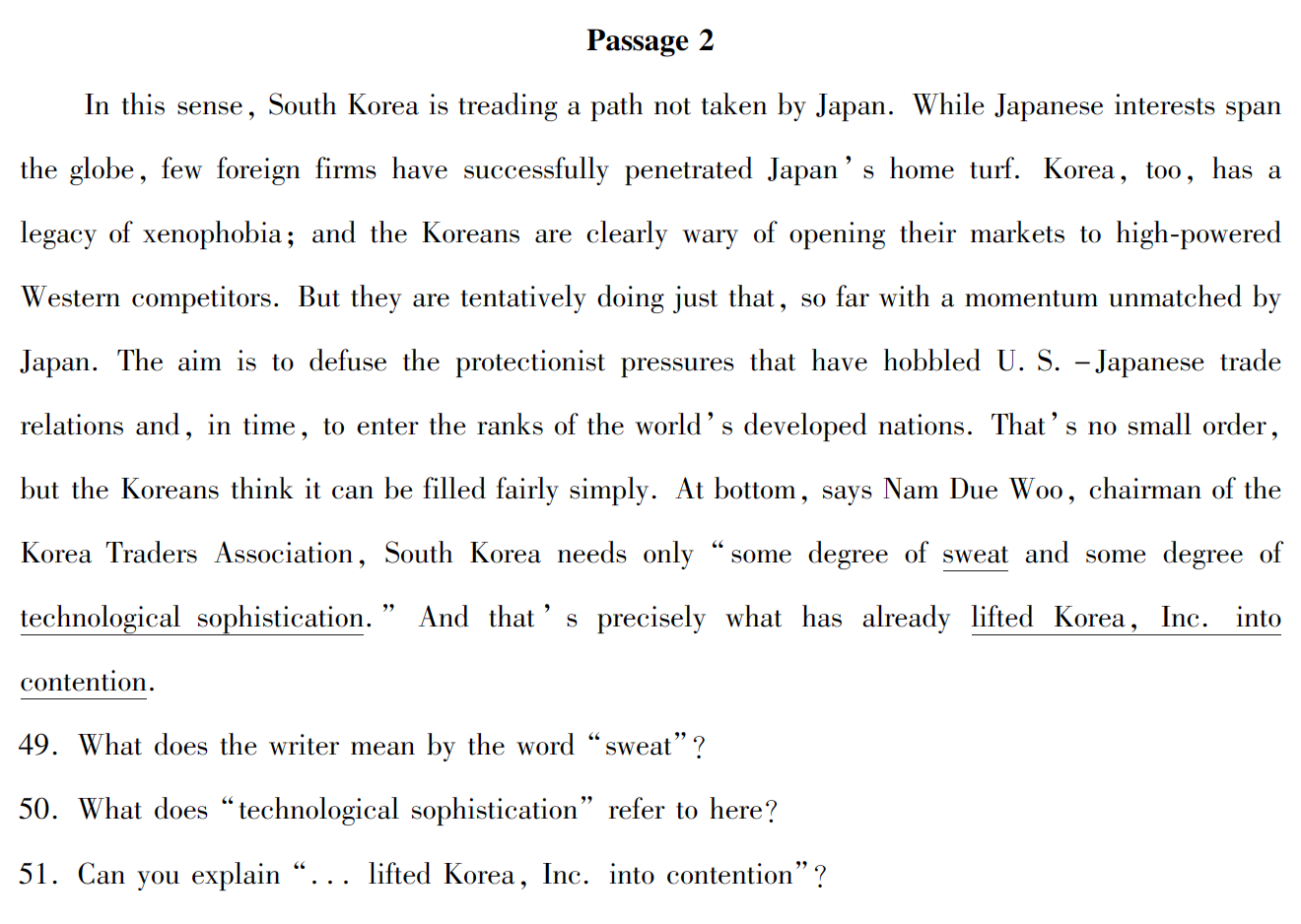 【题目解析】:49. sweat意为”努力“。50. technological sophistication指的是尖端技术,先进技术。51. 意味着,正是上述的因素使韩国成为一个正在崛起的世界贸易大国,并有能力与美国等国展开竞争。我们的产品在国际市场上畅销不衰。