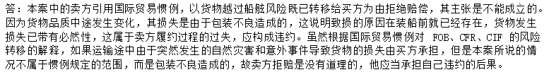 【正确答案】:应由卖方负责。(2分)INCOTERM1S2010中的风险是指意外事件,如果损失是由合同的一方没有履行自己的义务所造成的,则由责任方承担责任,(3分)而不论此时货物是否已经上船。(2分)按照INCUTERMS2010,FOB的卖方有提供适当包装的义务。(3分)